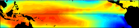 In this picture of surface temperatures in the tropical pacific, you can see how warm water accumulates in the West Pacific at during a normal year. Compare with El Niño or La niña.