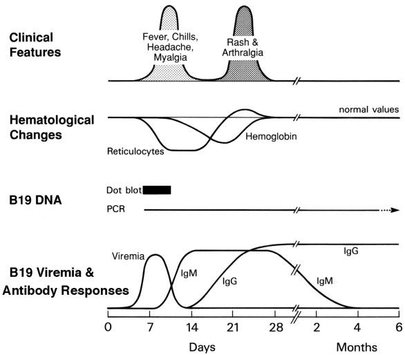 In 10 to 12 days after initial infection of the volunteers with B19 virus, IgM antibodies are detected in the serum, lasting for approximately 3 months. Beginning at approximately 2 weeks, IgG antibodies are also detected, which are believed to persist for life-long immunity (Heegaard, 2002).